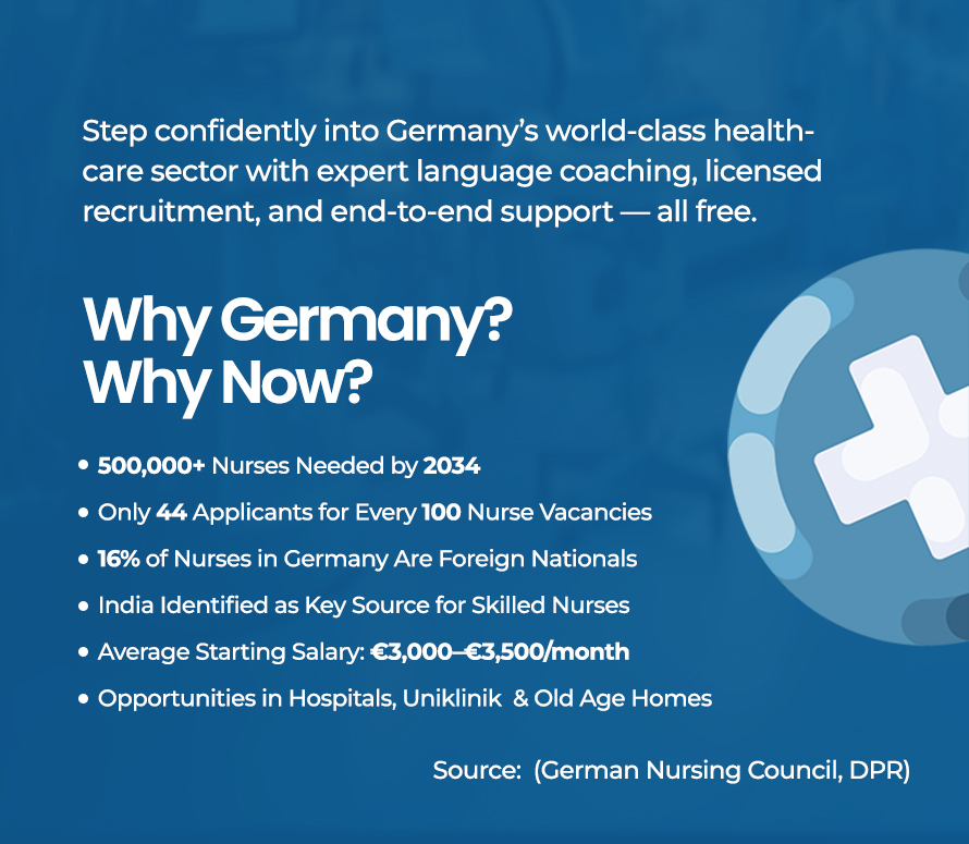 Germany’s nursing shortage offers Indian professionals a prime opportunity. IILT’s government-supported program provides free German language training (A1-B2), job placement, and relocation support for a seamless transition. Benefit from competitive salaries and career growth in a stable healthcare system.